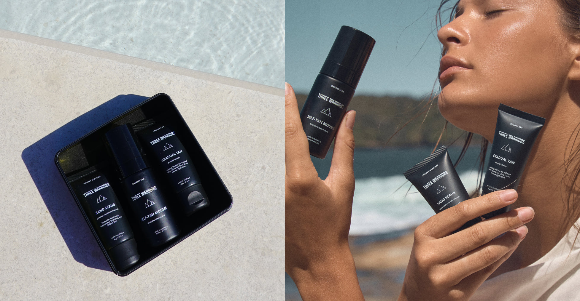 We are a brand that cares. Bringing salon quality organic, natural self tan, spray tanning solutions, face tan and tanning scrubs to the world, minus the nasties. With the finest ingredients sourced from Hobart, Tasmania (our home state), Three Warriors is the only natural sunless tan range that has healing benefits and will leave you glowing from the inside out.